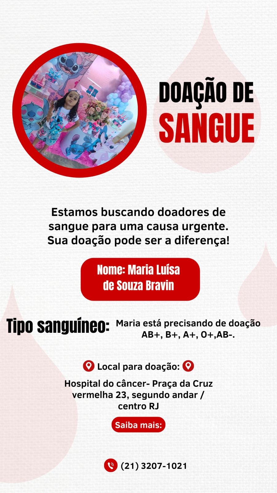 A linda Maria Luísa de Souza Bravin, de apenas três anos de idade, realiza tratamento oncológico e necessita, com urgência, de doação de sangue (A+, B+, O+, AB+ ou AB-).